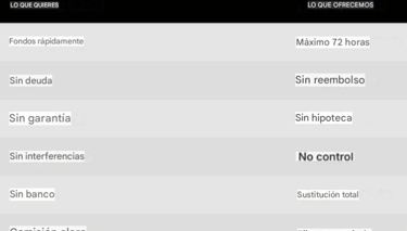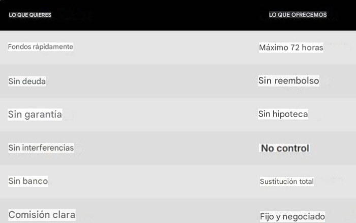 Si la primera reunión va bien y te unes a nuestro sistema, te proporcionaremos financiación en efectivo, sin tránsito bancario ni transferencia electrónica, en un plazo razonables, contrariamente a los bancos, dependiendo de los fondos y el proyecto de cada cliente.